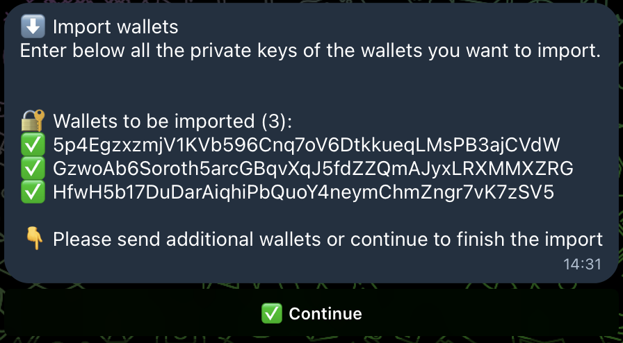 Send multiple private keys in one message separated by a space, comma or a new line. You can send multiple messages to send additional wallets or press continue to finalize the import.&#x20;
